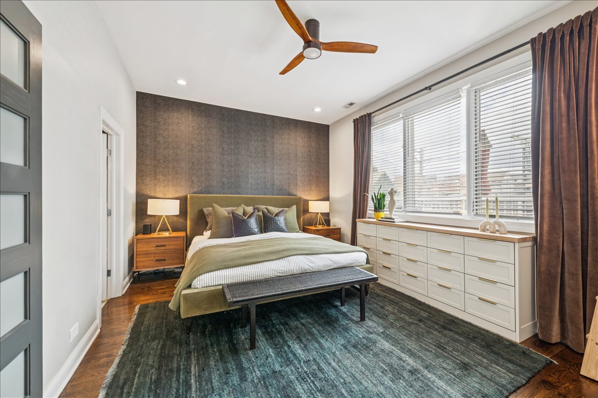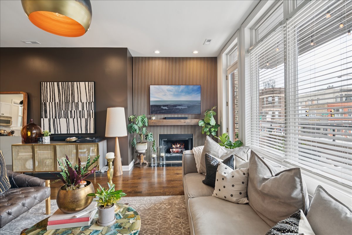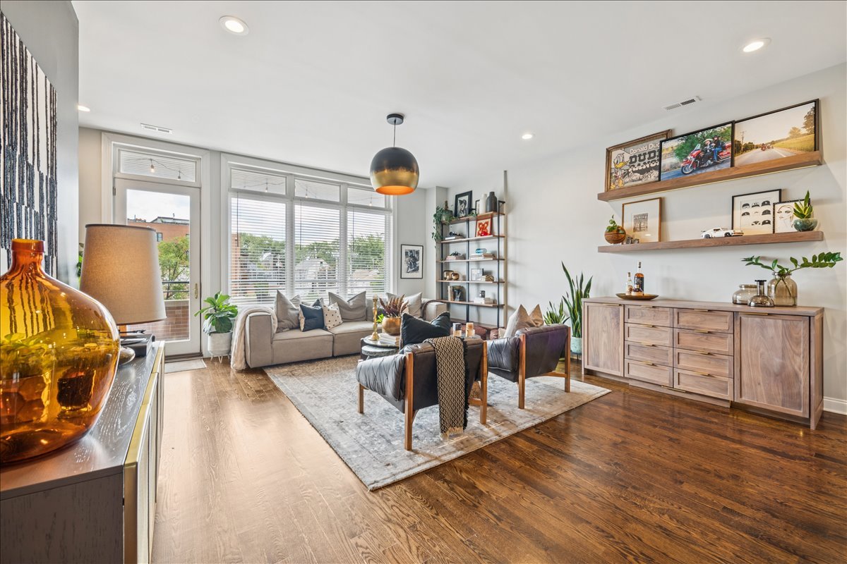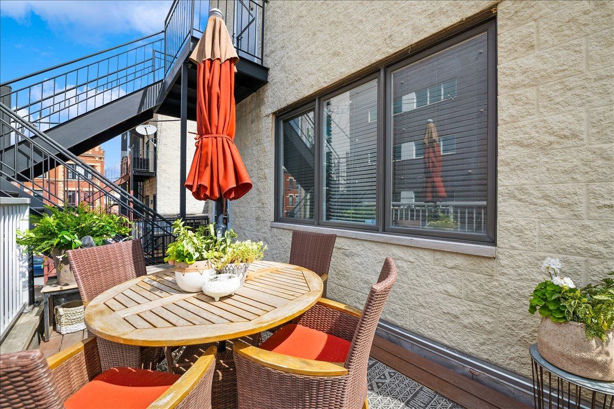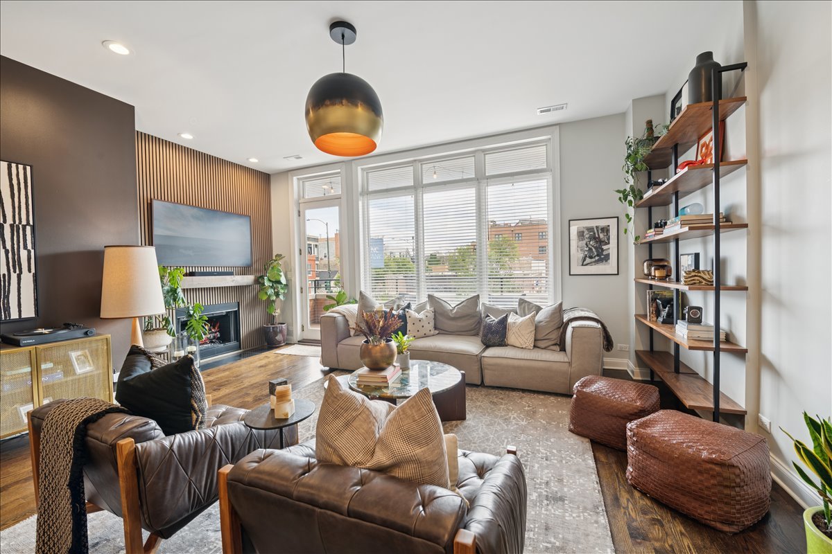 In the heart of Bucktown, this thoughtfully updated and meticulously maintained extra-wide two bedroom, two bathroom condo offers the perfect blend of style, comfort, and location. The home welcomes you with an expansive and light-filled layout, where oversized windows pour in sunlight and a rejuvenated gas fireplace creates a warm centerpiece for the living space. Just beyond, a private walk-out terrace runs the full width of the home, an ideal extension for grilling, entertaining, or simply enjoying the fresh air. The beautifully renovated kitchen is both functional and stunning, with crisp white cabinetry, quartz countertops, a massive island with seating, a new beverage fridge, and top-of-the-line appliances. Rather than a traditional dining area, the owners created a custom bar that makes entertaining effortless and gives the home a truly unique personality. The primary suite is a serene retreat, offering a newly built walk in closet with full wall custom storage and a spa like bathroom featuring dual sinks, quartz counters, a soaking tub, and a separate glass shower. The second bedroom provides flexibility as a second bedroom or home office, and is complemented by another fully renovated bathroom that mirrors the home's elevated design. A second private outdoor escape awaits on the expansive west facing deck at the rear of the home, where natural light lingers into the evening and the setting is perfect for unwinding or hosting friends. With two parking spaces one garage and one exterior and every modern update imaginable, including a refreshed fireplace, new custom refrigerator, washer and dryer, LED lighting, and fresh paint throughout, the home is completely turnkey. Best of all, the location could not be more ideal. Just steps from Bucktown and Wicker Park's renowned dining, shopping, nightlife, and the 606 Trail, with effortless access to 90/94, this condo captures the essence of city living in one of Chicago's most desirable neighborhoods.